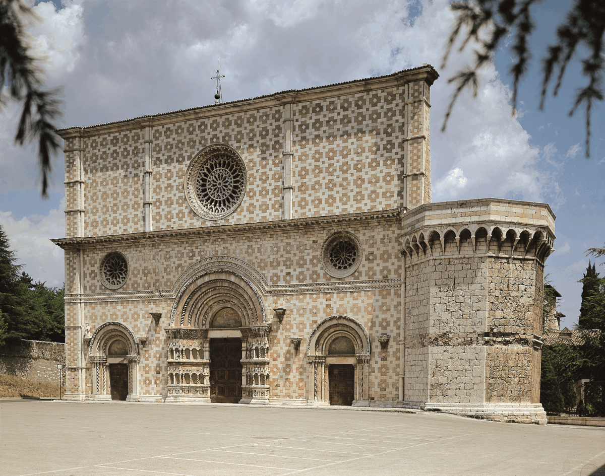 Situata su una collina tra Porta Bazzano e il Tratturo Magno, la Basilica di Collemaggio rappresenta un emblema storico e religioso della città dell’Aquila. Eretta nel XIII secolo per volere di Pietro da Morrone, poi Papa Celestino V, il complesso racchiude secoli di storia e diversi stili architettonici, dai dettagli gotici alla vibrante facciata orizzontale policroma. Ogni angolo racconta storie di fede e rinascita, con affreschi preziosi e particolari artistici unici come il rosone centrale, i motivi geometrici e la lunetta affrescata sopra la Porta Santa.