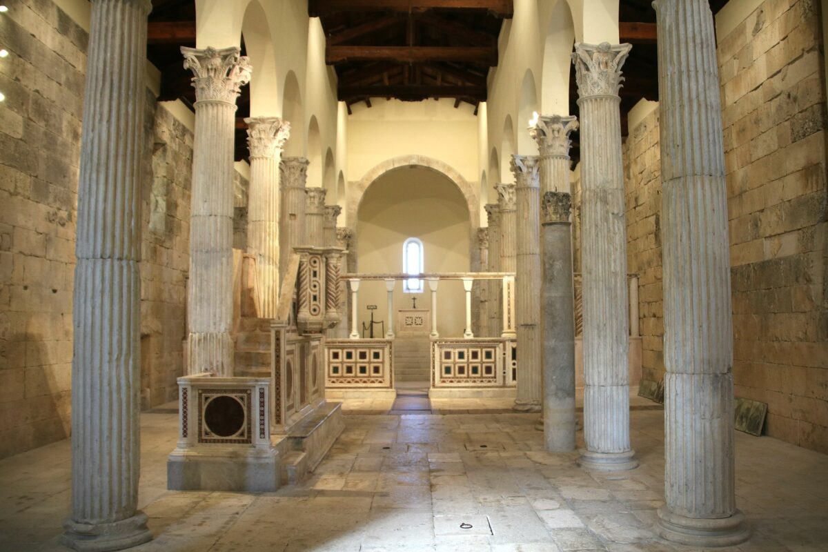 San Pietro in Albe, situata all’interno dell’area archeologica di Alba Fucens, rappresenta un esempio unico di architettura romanica e di stratificazione storica. Costruita nel XII secolo sui resti di un antico tempio italico dedicato ad Apollo, la chiesa custodisce secoli di storia e arte, tra affreschi, colonne romane e arredi cosmateschi.